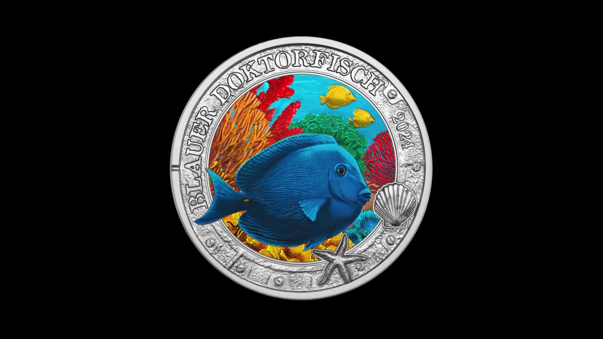 Die nächste Ausgabe von Österreichs UV-Leucht-Münzen widmet sich dem blauen Doktorfisch. Seinen Namen verdankt er den scharfen, skalpellartigen Stacheln am Schwanzansatz, die wie chirurgische Instrumente wirken und zur Verteidigung verwendet werden. Der blitzblaue Fisch ist für die Gesundheit von Korallenriffen von großer Bedeutung, da er Algen von Korallen und Felsen abweidet, die ansonsten das Wachstum des Riffs behindern würden. Als eifriger "Gärtner" trägt er so dazu bei, die Schönheit und Vielfalt des Meeres zu bewahren. Seine Aufnahme in diese Münz-Serie verdankt der blaue Doktorfisch seiner Eigenart, im jungen Alter unter speziellem Licht stark grünlich zu leuchten.