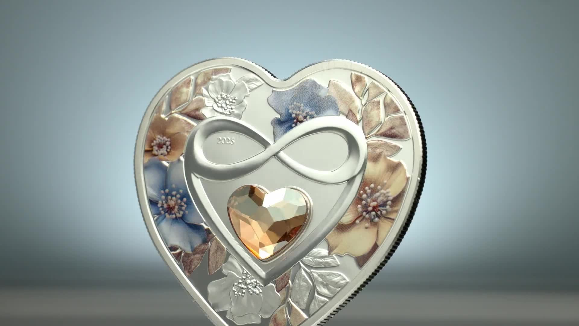 Das liebevolle Design auf der Vorderseite zeigt ein kunstvoll gestaltetes Unendlichkeitssymbol, das zu einem Herzen erweitert wurde. Umgeben ist es von floralen Elementen in zarten Pastellfarben, die dem Motiv eine elegante Ausstrahlung verleihen. Abgerundet wird das Design von einem prächtigen herzförmigen Kristall in der Mitte. Sie erhalten Ihre Silbermünze in einer schützenden Kapsel und mit einer hochwertigen Aufbewahrungsbox zur Präsentation des beeindruckenden Sammlerstücks.