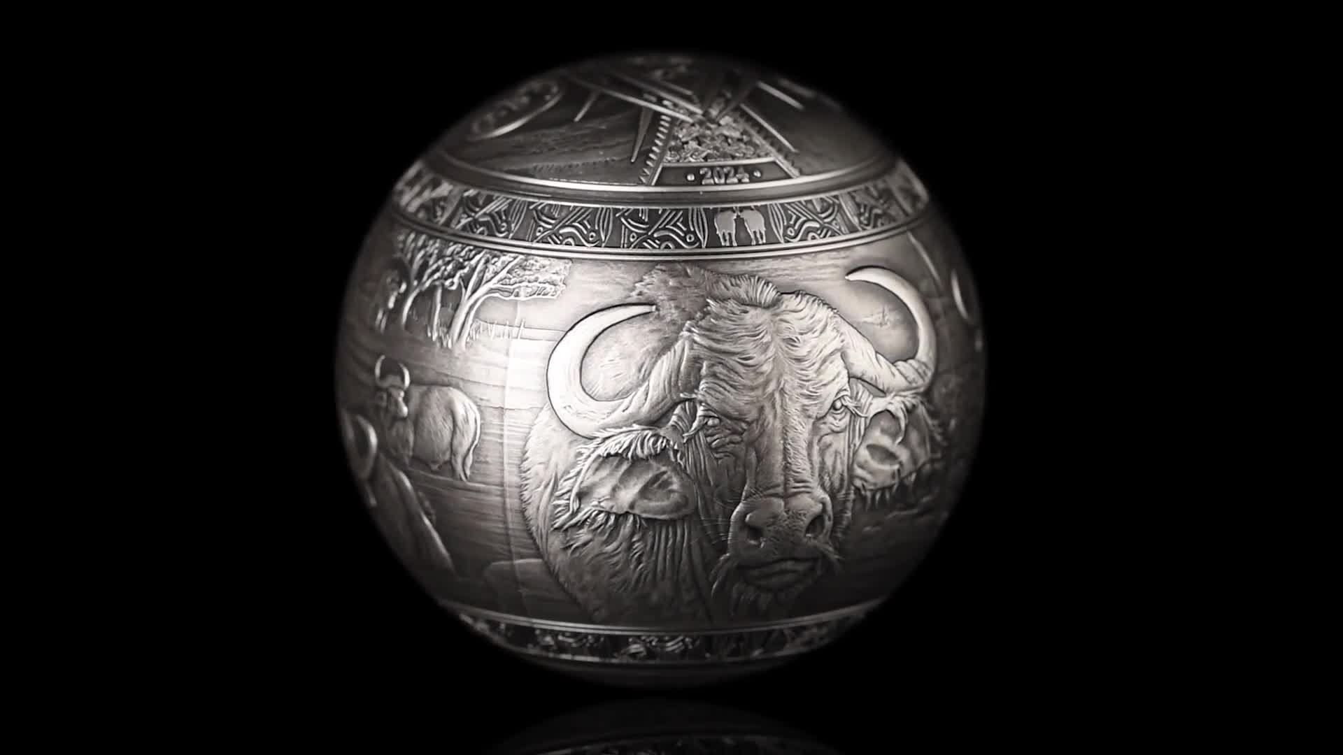 Eingebettet in eine wunderschöne Savannen-Landschaft wurde der Büffel in mehreren, von Künstlerhand geschaffenen Motiven auf einem riesigen Durchmesser von 56 Millimetern abgebildet. Geprägt wurde dieses Kunstwerk aus 1 Kilogramm reinem Silber (999/1000) und anschließend mit Antik-Finish veredelt, was ihr ein edles und antikes Antlitz verleiht. Wie sie es auch drehen und wenden - auf diesem Prachtstück erleben Sie die Hornträger im atemberaubenden 360-Grad-Panorama. Jede Perspektive wurde dabei auf meisterhafte Weise mit viel Liebe zum Detail gestaltet und reliefartig herausgearbeitet.