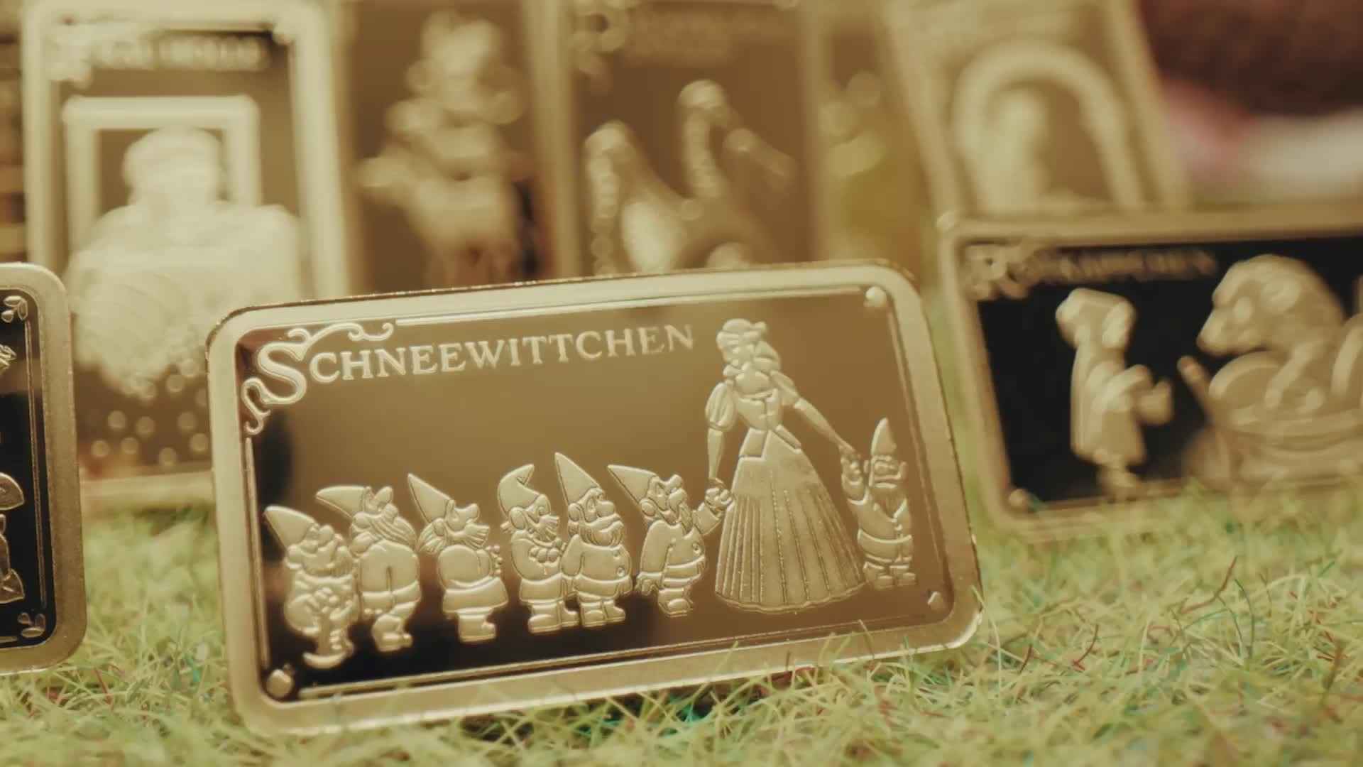 Den Auftakt in diese zauberhafte Kollektion bildet der Goldbarren "Schneewittchen", der an die Geschichte der schönen Königstochter erinnert, die durch die Eifersucht ihrer Stiefmutter in Lebensgefahr gerät und bei sieben Zwergen Schutz findet.