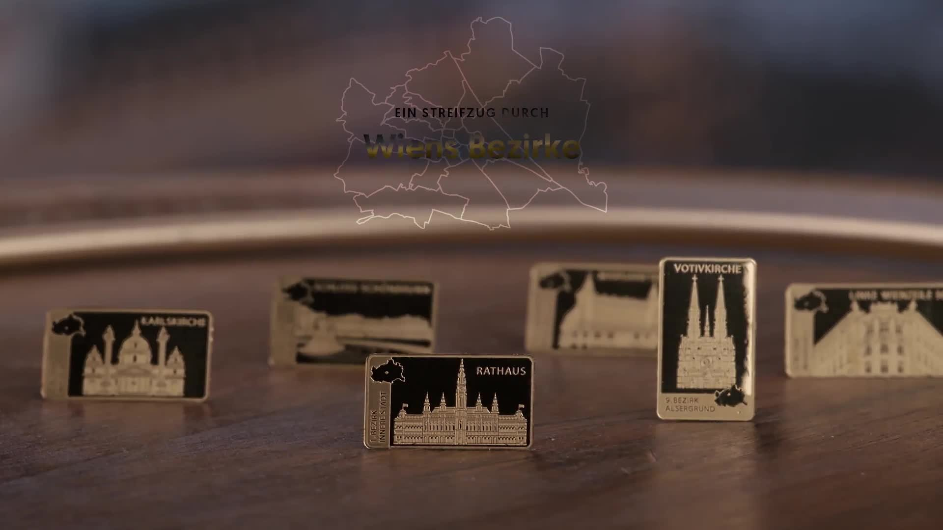 Jedem einzelnen Bezirk wird nun ein meisterlich gestalteter, offizieller Gedenkbarren aus reinstem Gold (999,9/1000) in der höchsten Prägequalität Polierte Platte gewidmet und dazu der Stadt Wien eine krönende Abschluss-Ausgabe.